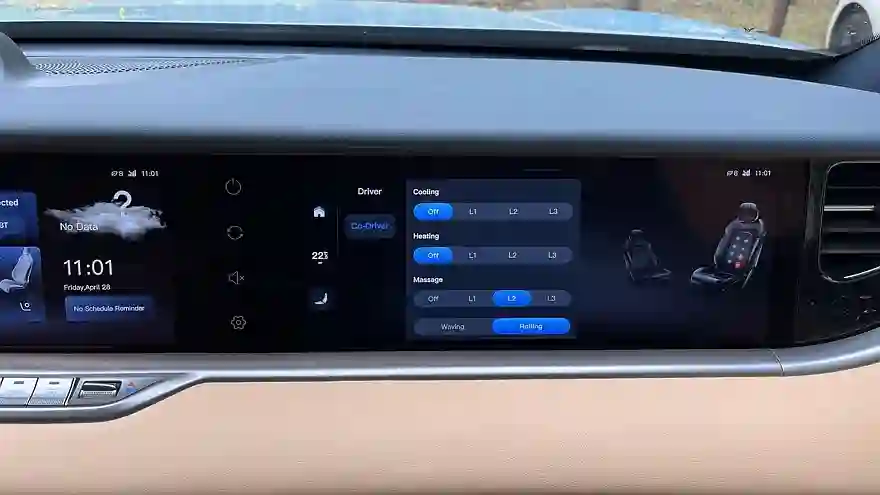 В салоне две широкоугольные салонные камеры, передняя с функцией face id. Каждая направлена на свой ряд сидений, можно делать селфи. Но это «побочный эффект», а основная задача – следить за водителем (система контроля усталости) и сидящими сзади детьми (изображение можно вывести на центральный или правый дисплей). Фронтальная камера обеспечивают и функцию видеорегистратора.