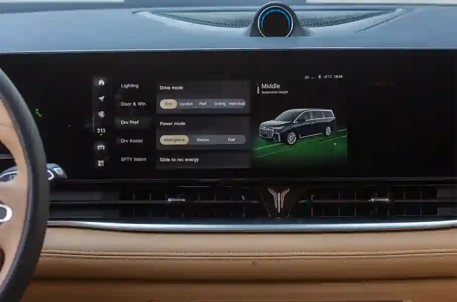 Для силовой установки предусмотрено три режима работы (Intelligence, Electric и Fuel) и пять ездовых режимов (Eco, Comfort, Performance, Outing и Individual). С эко, комфортным и спортивными режимами всё понятно, а вот Outing — это условно «внедорожный» режим, когда подвеска поднимается на максимальную высоту.