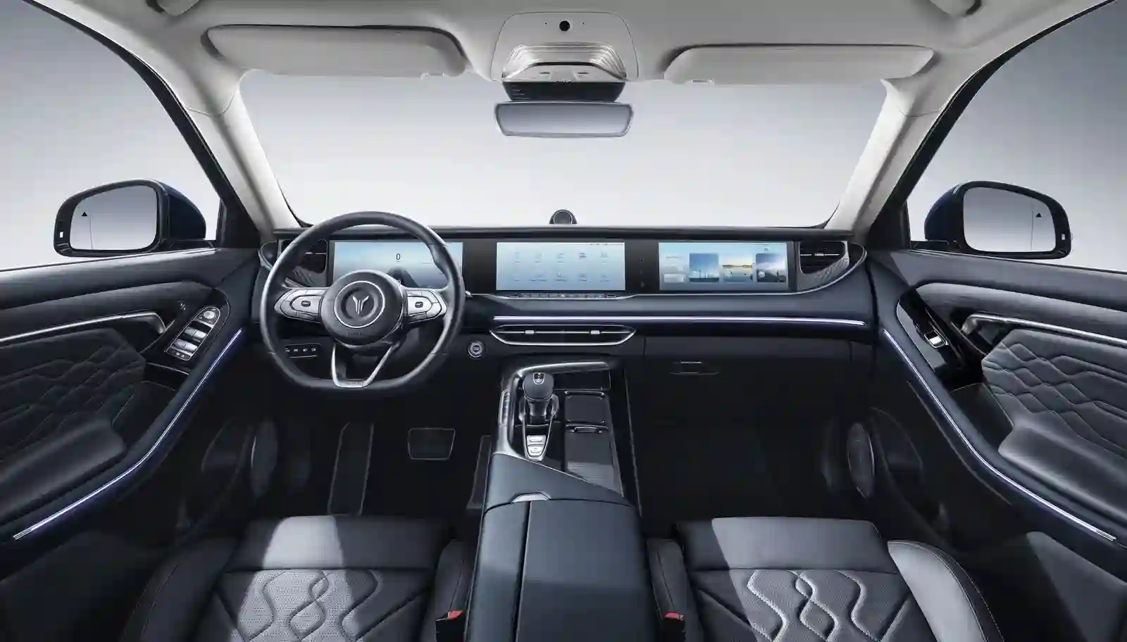 Интерьер скроен по лучшим канонам премиум-класса — двухцветная отделка (доступно три цветовые комбинации), экокожа (нет, не ради экономии, а ради окружающей среды), огромные экраны мультимедиа, удобная посадка, идеально подогнанные детали, тишина в салоне и многое-многое другое.
